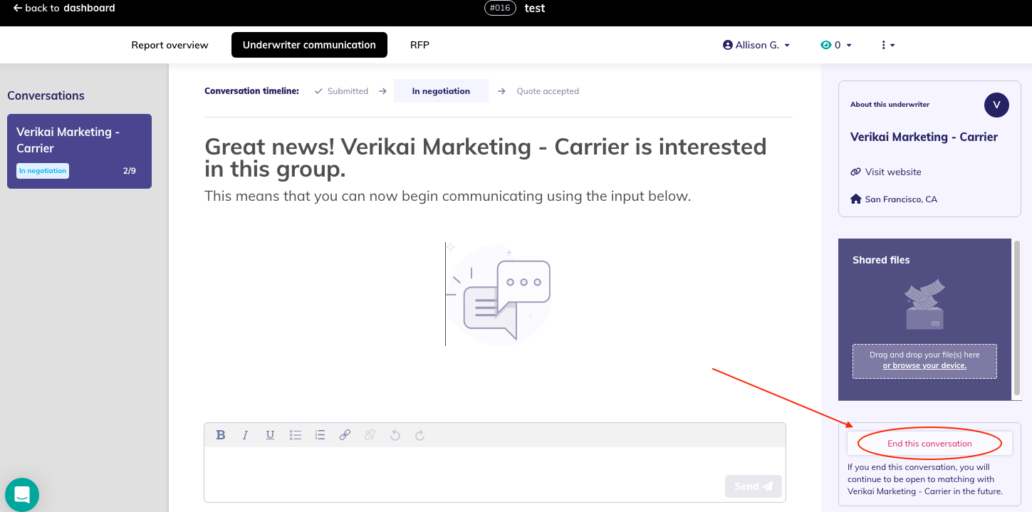 To close a request, click on the report you are wanting to close and toggle over to the "Underwriter Communications Tab". From there, click on the upper right button titled "End this chat".