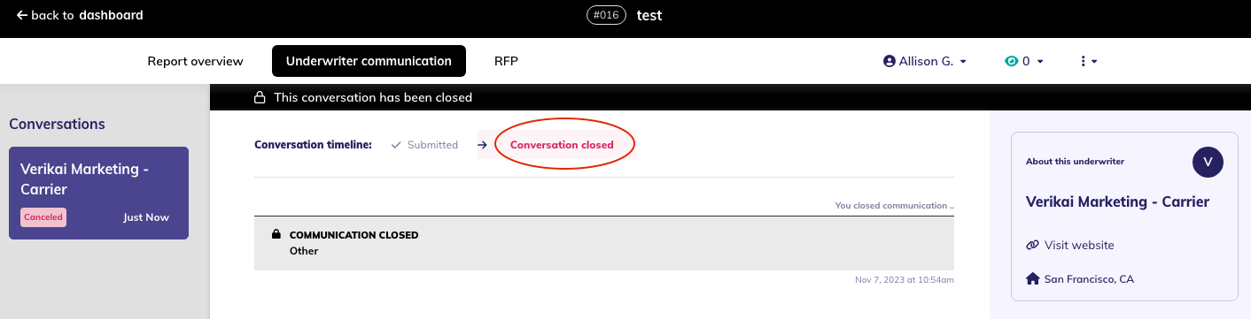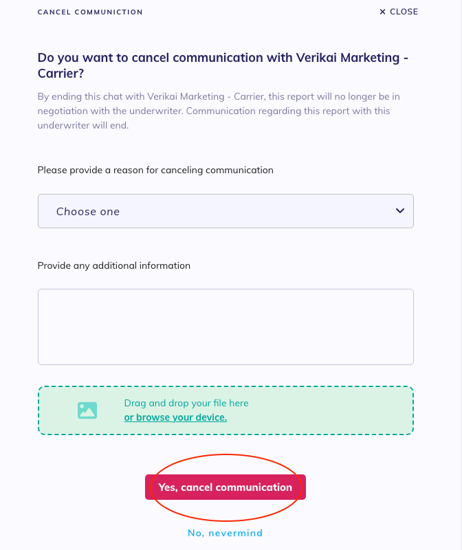 Once you click "Yes, cancel communication," the report will move to the "closed" tab on your dashboard. In this example, it moved from "in negotiation" to "closed."