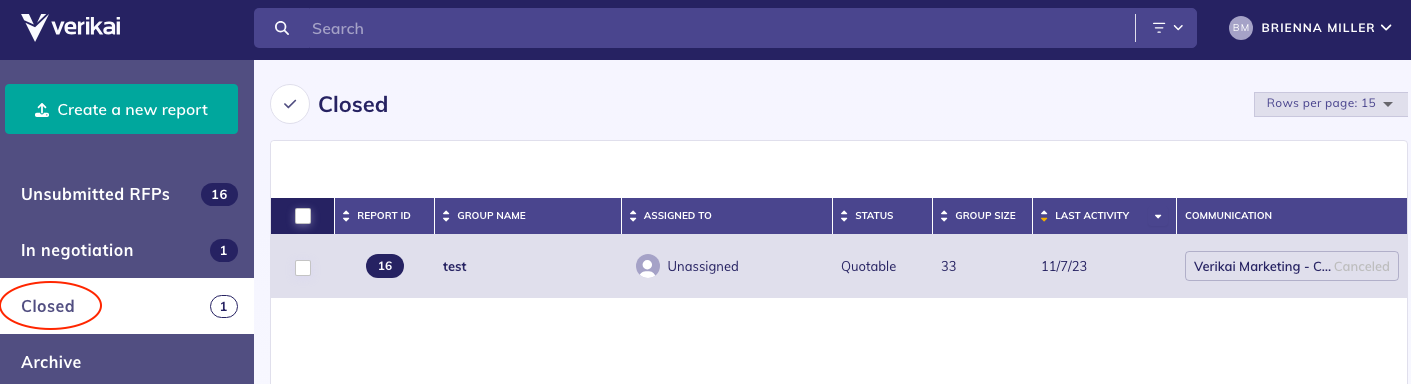 When communication is closed, the group is moved to the 'closed' tab on the main dashboard, as shown below.